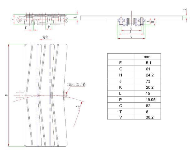 | 鏈條型號(hào) | 寬度(mm) | 重量(Kg/m) | 反向彎曲半徑(mm) | 轉(zhuǎn)彎半徑(mm) | |